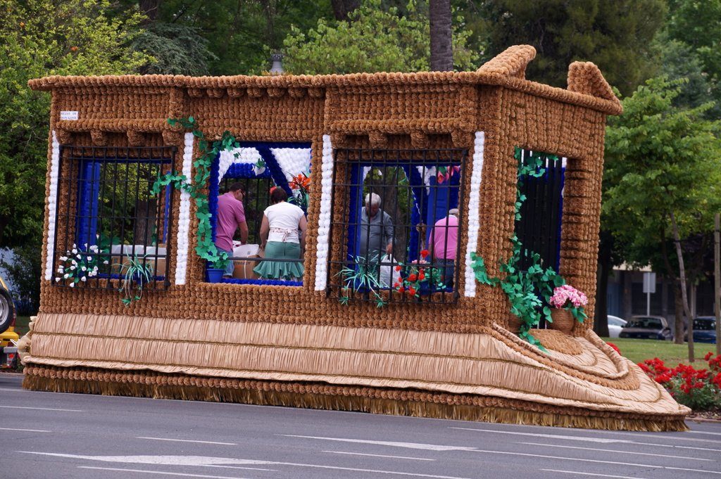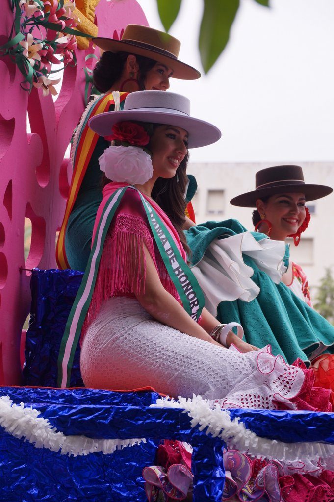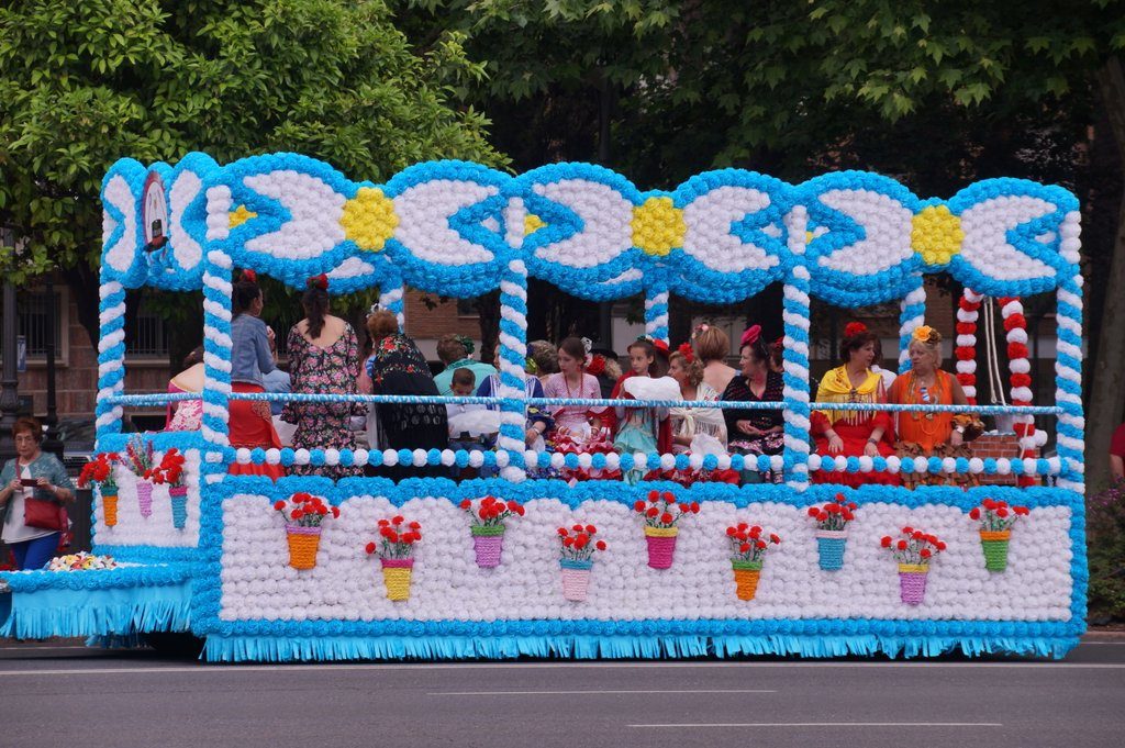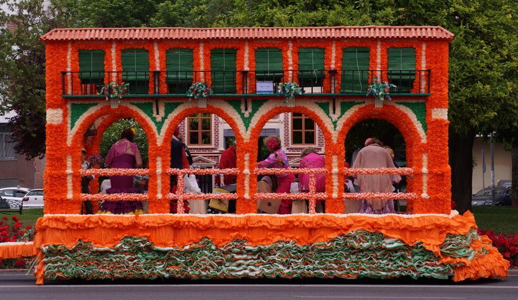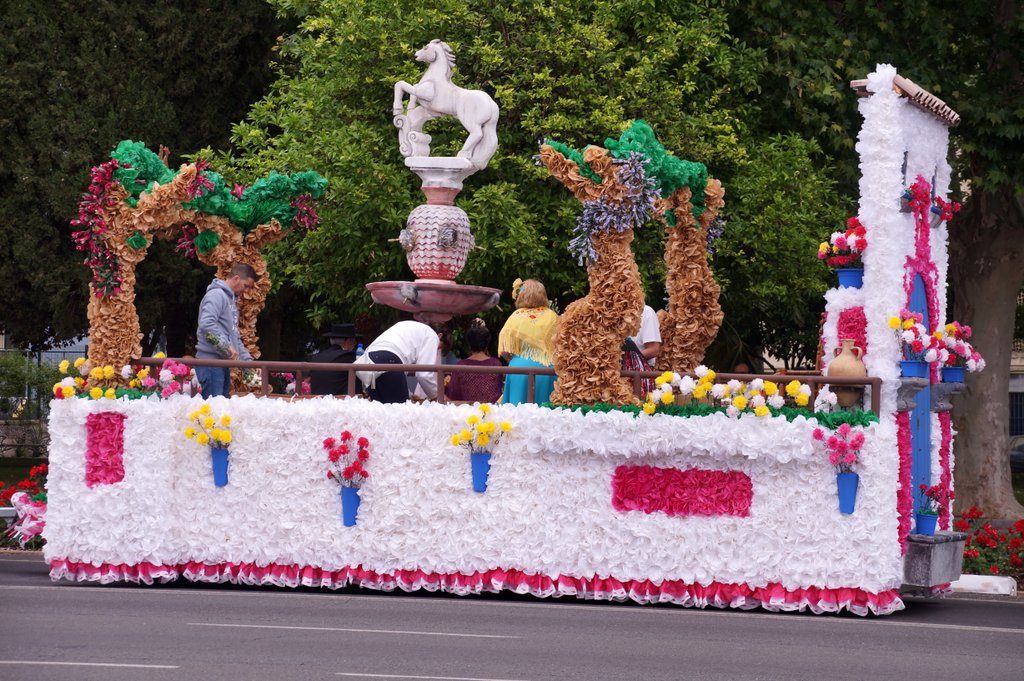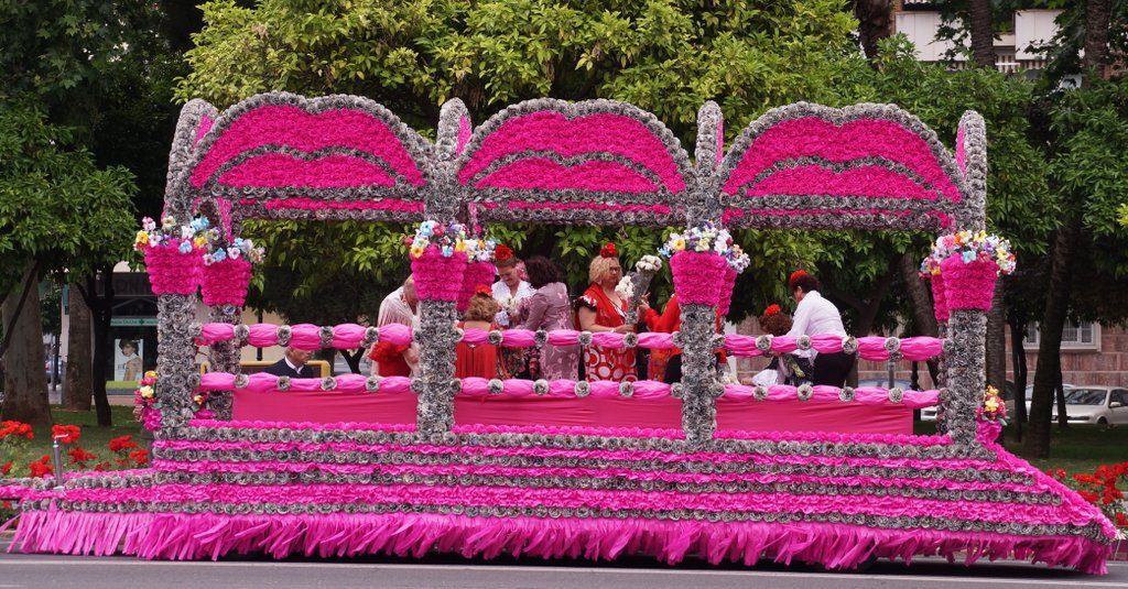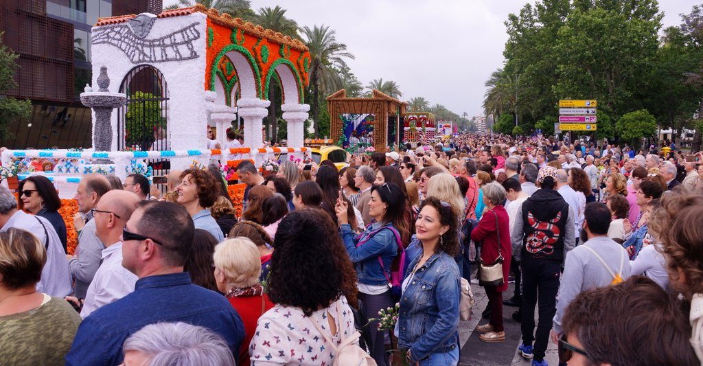 We arrive in the city at around 11 o’clock and park the car at the Centro Historico, from which we walk in the direction where everyone is going. Very soon, we see the first floats pass by. For today is the Battle of the Flowers. Which means that there are 14 floats, decorated with thousands of paper flowers and “inhabited” by (mostly) women in colourful traditional outfits.