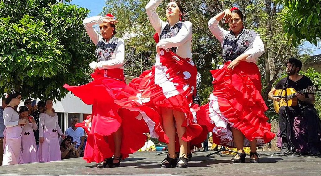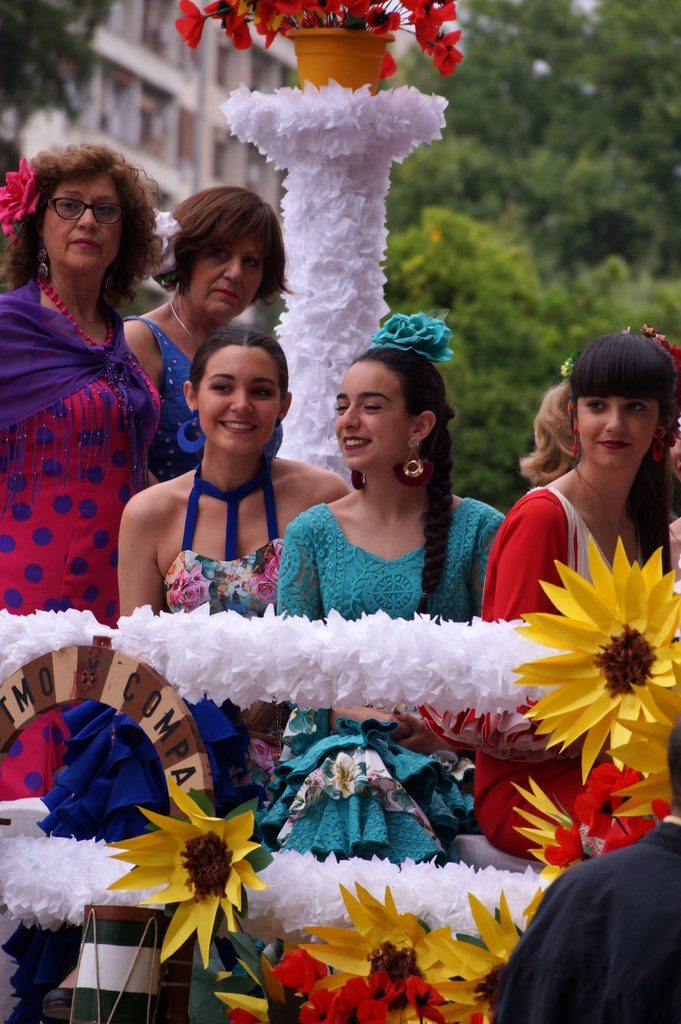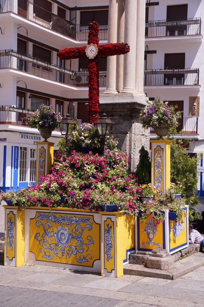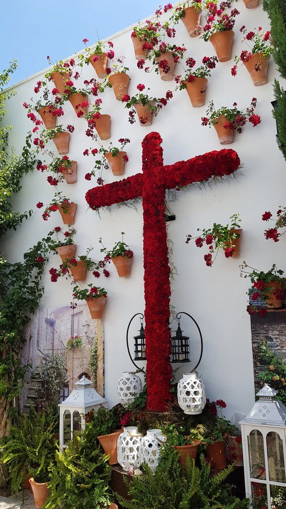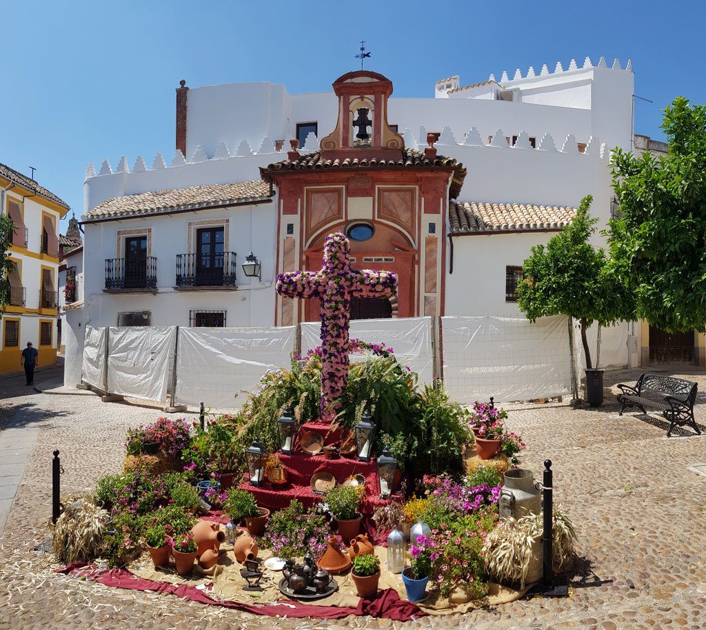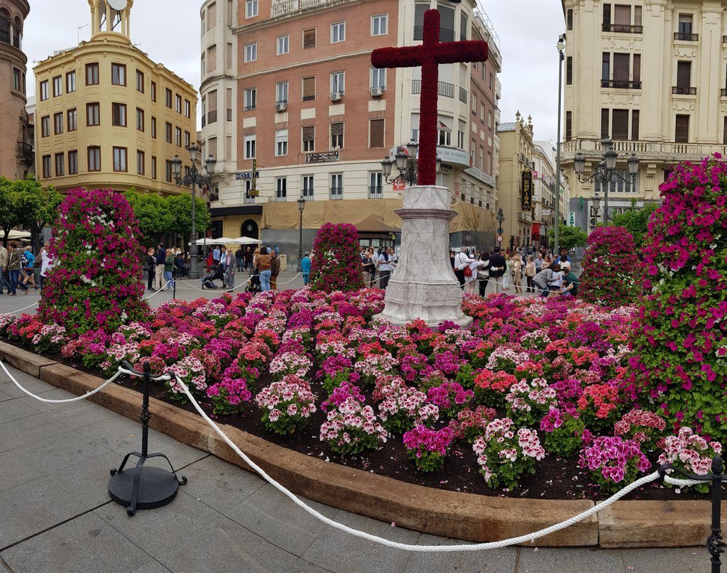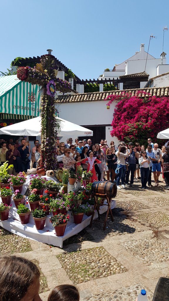 We spend the afternoon meandering through the city. It’s the last day of the May crosses and we very much enjoy the festive atmosphere that comes with it. It’s a contest of crosses, decorated with flowers. Many neighbourhoods join in the contest, and at every cross, there’s a (tapas) bar with music. Sometimes even live music and Flamenco dancing and singing, as we discover!