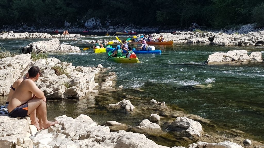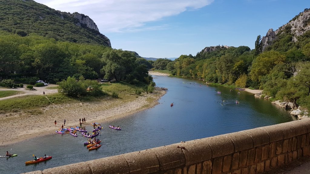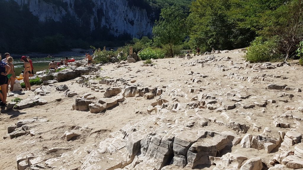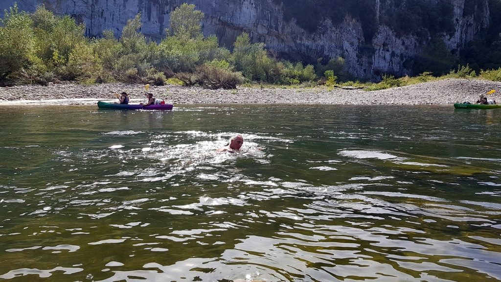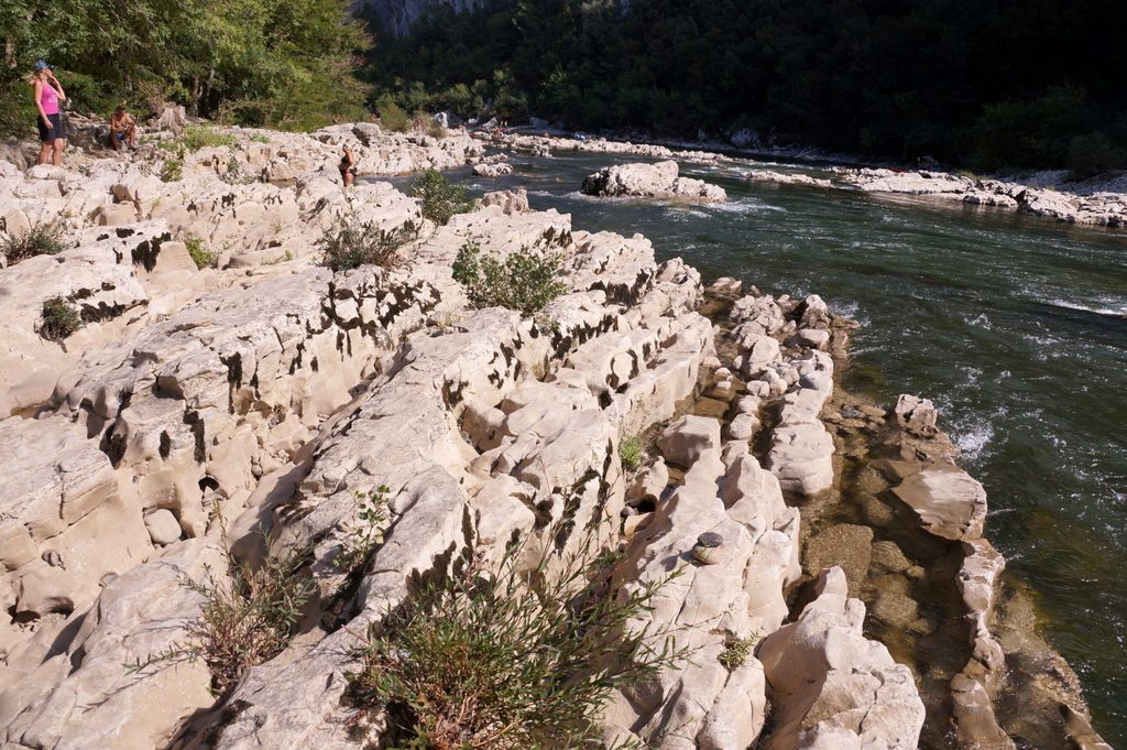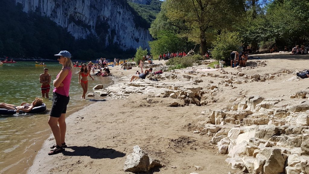 We follow the river Ardèche and eventually find a place where we can reach the water. First, we have lunch there on a beach consisting of large pebbles. Afterwards, we go into the water to cool off. The temperature is nice; not too cold, neither too warm.