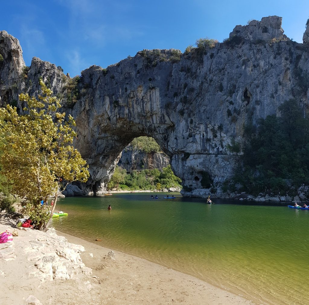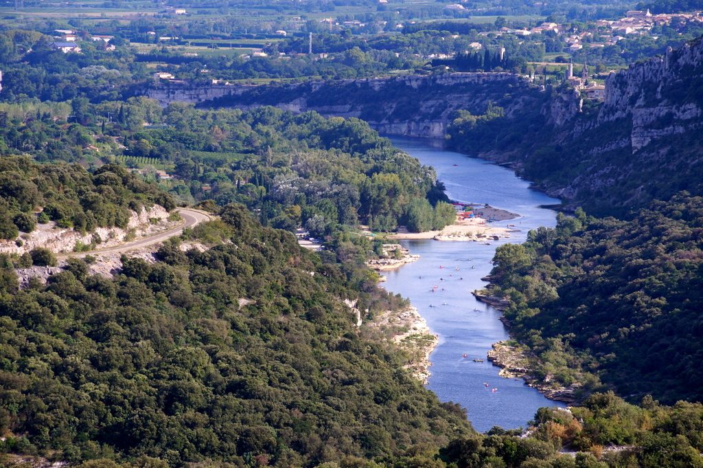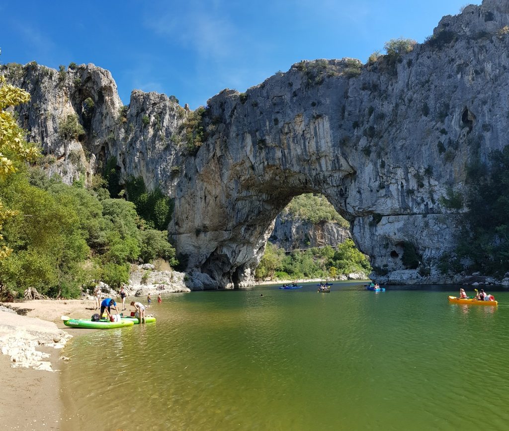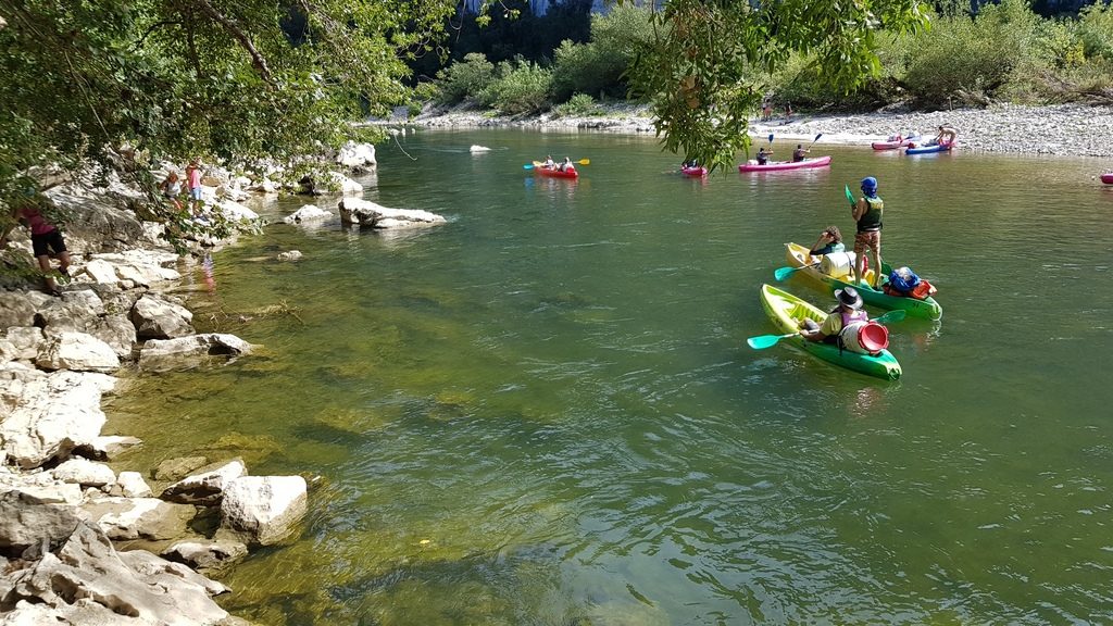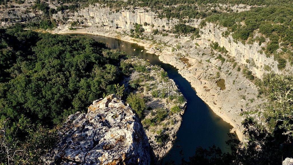 We follow the river Ardèche and eventually find a place where we can reach the water. First, we have lunch there on a beach consisting of large pebbles. Afterwards, we go into the water to cool off. The temperature is nice; not too cold, neither too warm.