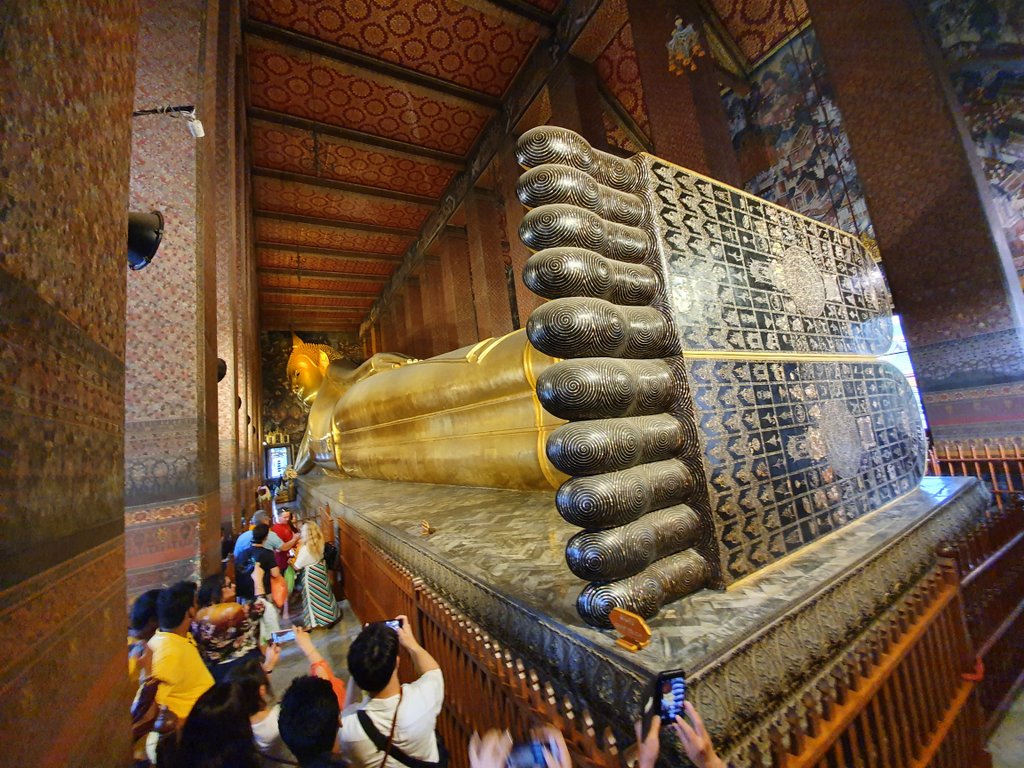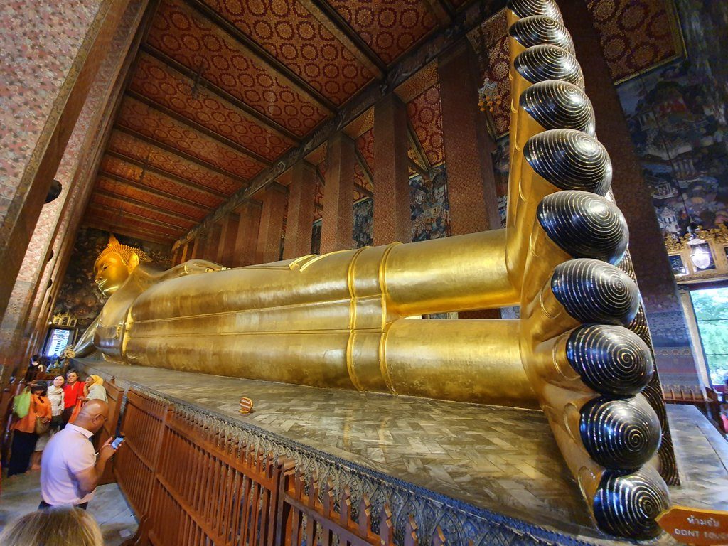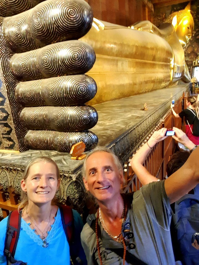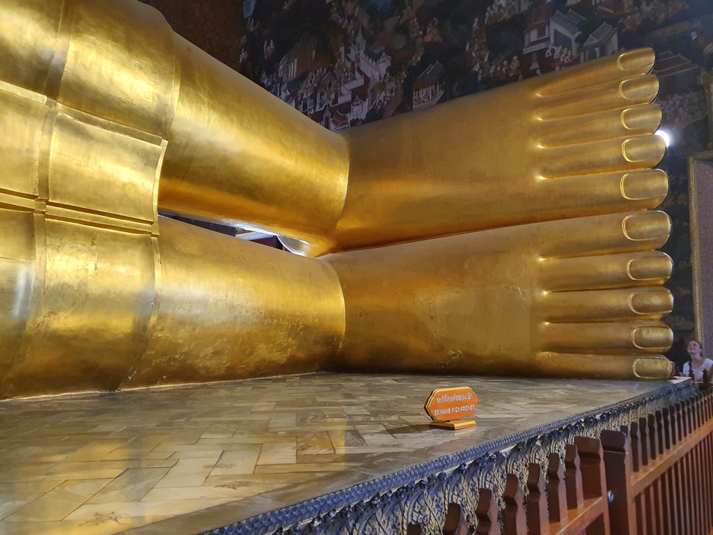 After a belated lunch, we visit Wat Pho and The Temple of the Reclining Buddha. It’s one of the biggest buddha statures in the world at 44 meters long and 15 meters high. And it’s completely covered in gold. Except for the feet. They are black ornamented with mother of pearl inlays, depicting all sorts of scenes. Absolutely amazing to behold. Who ever thought of creating a statue this big? We buy a cup of small change and distribute the coins over the dozens of bowls that are there to receive them.