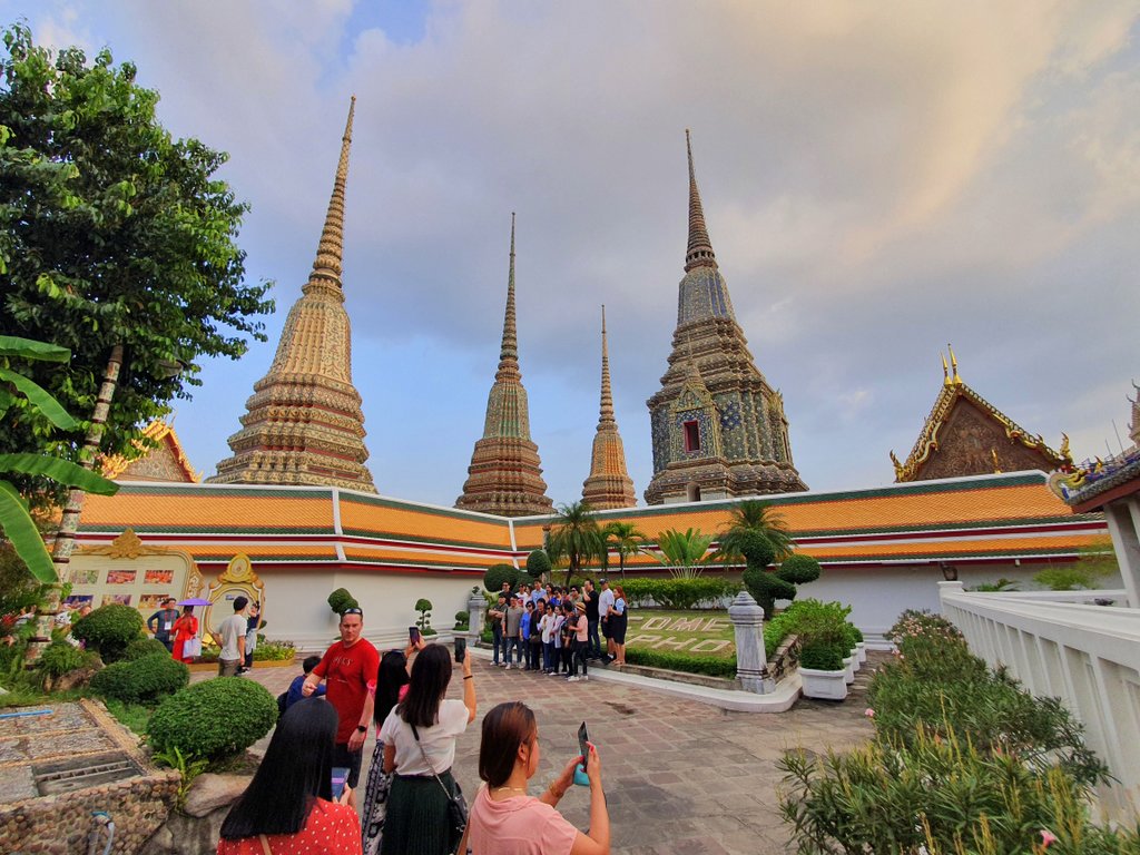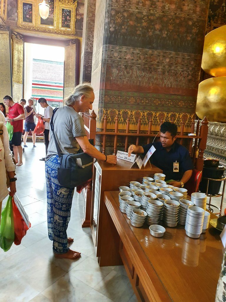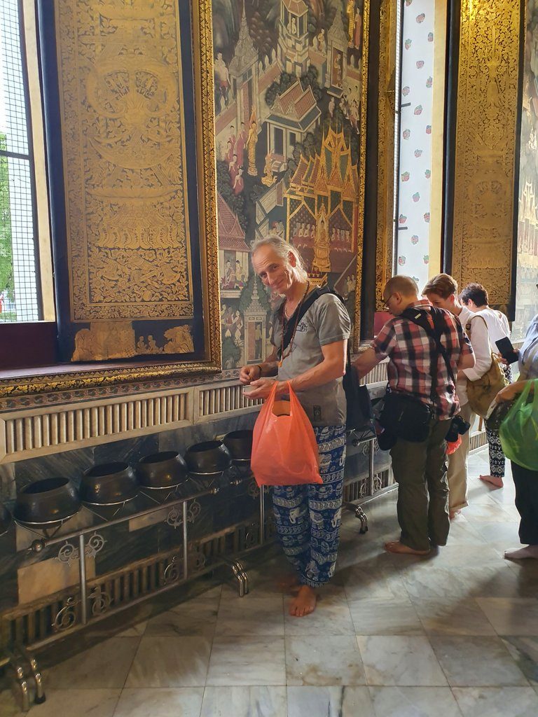 As we stroll around the grounds of Wat Pho taking in all the beauty, we stumble upon another temple. We hear chanting inside and, curious, we enter. There are monks sitting to the left side, chanting. To the right, all kinds of people are sitting, enjoying the sound and some women even participate in the chanting of the mantras. Very beautiful. We spent some time there, meditating a bit in the perfect atmosphere.