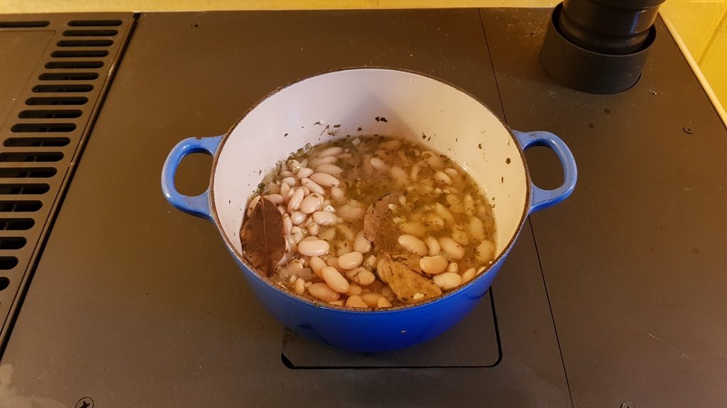 We enter the hall and quickly scan the place. It looks good. As we start walking past the stands we become more and more enthused. There’s a wide variety of fresh foods on offer, and the prices are extremely reasonable. Very soon, we find haricots tarbais for € 10 per kg, no matter how much (or little) you buy. So we buy 2 kg; half a kg for ourselves and the rest to give away to family and friends. And here our first cooking result: