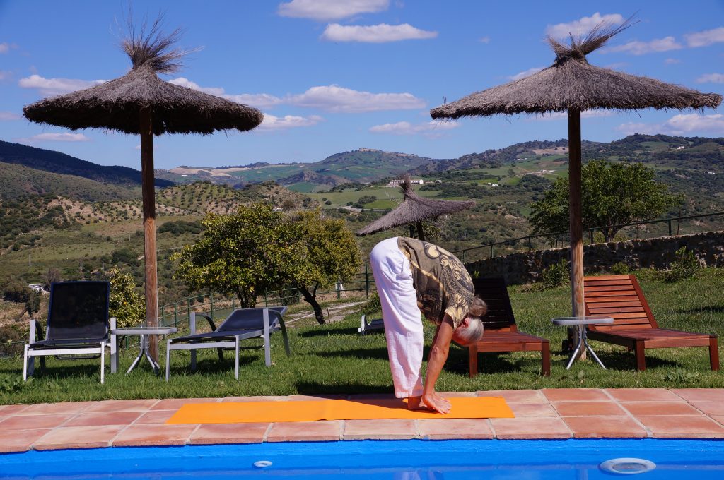 Do not force in the beginning but just let your upper body hang and let go … never try to touch the ground if it does not work right away. Never pull down with excessive force. In the beginning, you can bend the knees slightly. Give your body the necessary time for the tendons to slowly yield. Agility increases with regular exercise. In the beginning you can stay in the position for 5 to 10 breaths. Over time, you can calmly build up to 30 breaths or more. You consciously let your head hang like a pendulum. You can also hold your elbows with your hands and let gravity do it’s work.