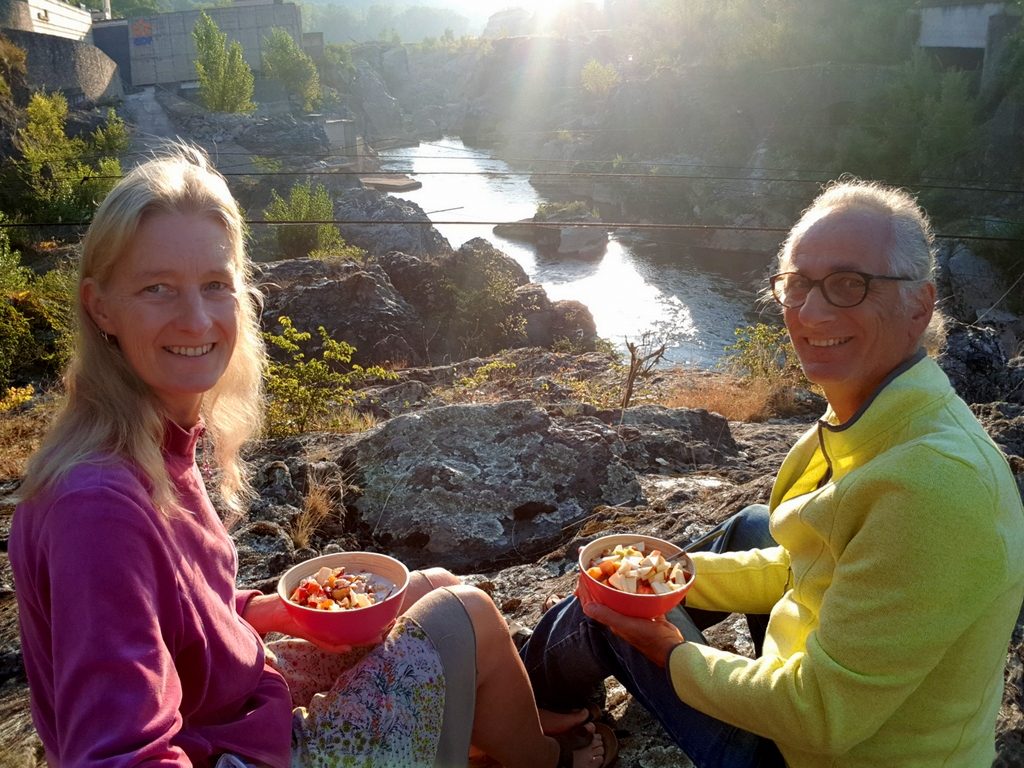 We find a sunny spot next to some wild water in Saint Juéry. We prepare our muesli and eat on the rocks, looking out over the rapids while the sun rises higher and higher in the sky. Stunning!
